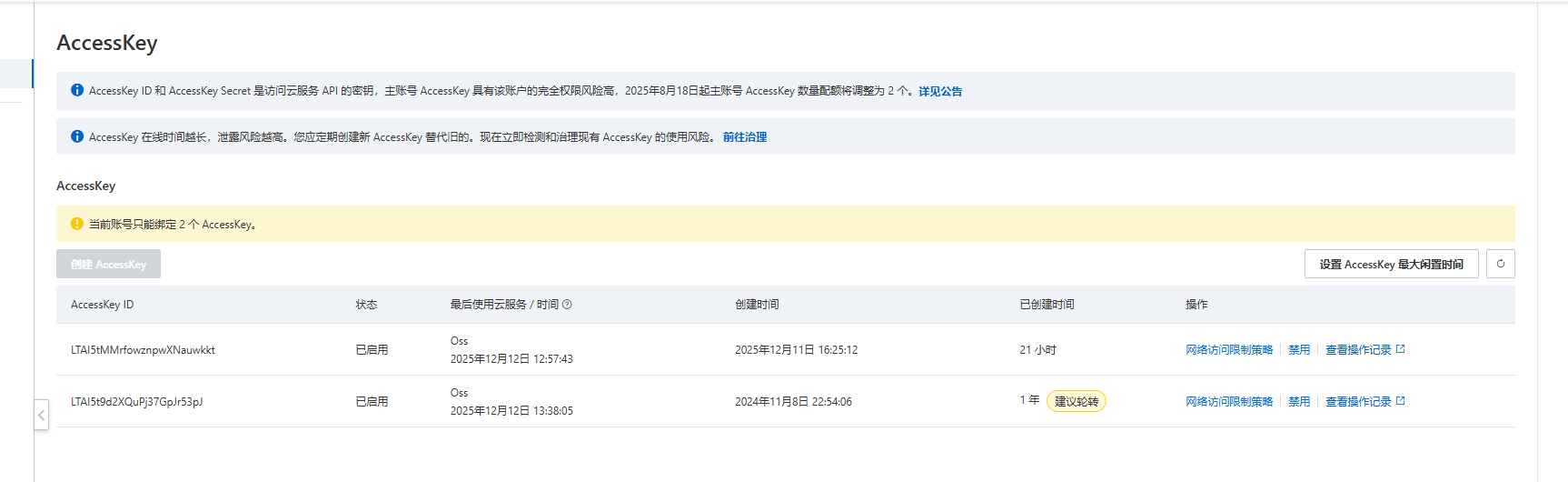 进入对应的界面每个账户只能建立2个,对应的AccessKey ID和AccessKey Secret